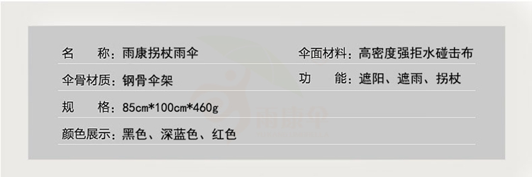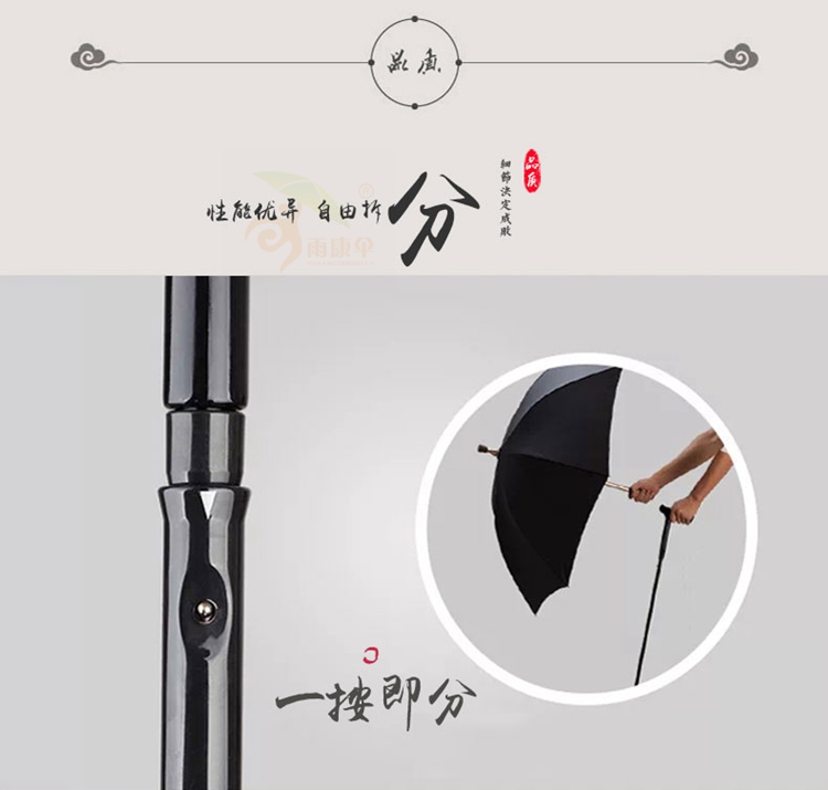 老人分离拐杖伞是做工品质非常好的一把伞。老人拐杖伞既可以在不下雨时拐杖使用,也可以在下雨时抽出拐杖,一手拿拐杖、一手撑开伞用来遮雨。因针对老年人出门带伞的心理困扰而设计出的一支分离拐杖伞,让年长者在别人的观点上,拿的是一个拐杖,而非雨伞。这把老人拐杖伞以拐杖及雨伞两用式的用法。老人拐杖伞外棒采用高档铝合金材质,较为轻便。强化耐用又安全,对年长者来说不会造成负担。尾部有一橡胶止滑垫,使用拐杖伞时不易滑倒。