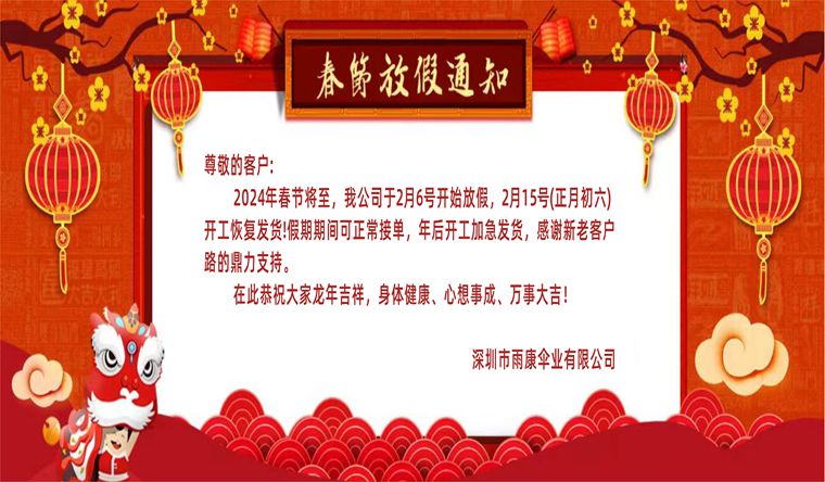 尊敬的客户: 2024年春节将至,我公司于2月6号开始放假,2月15号(正月初六)开工恢复发货!假期期间可正常接单,年后开工加急发货,感谢新老客户路的鼎力支持。 在此...